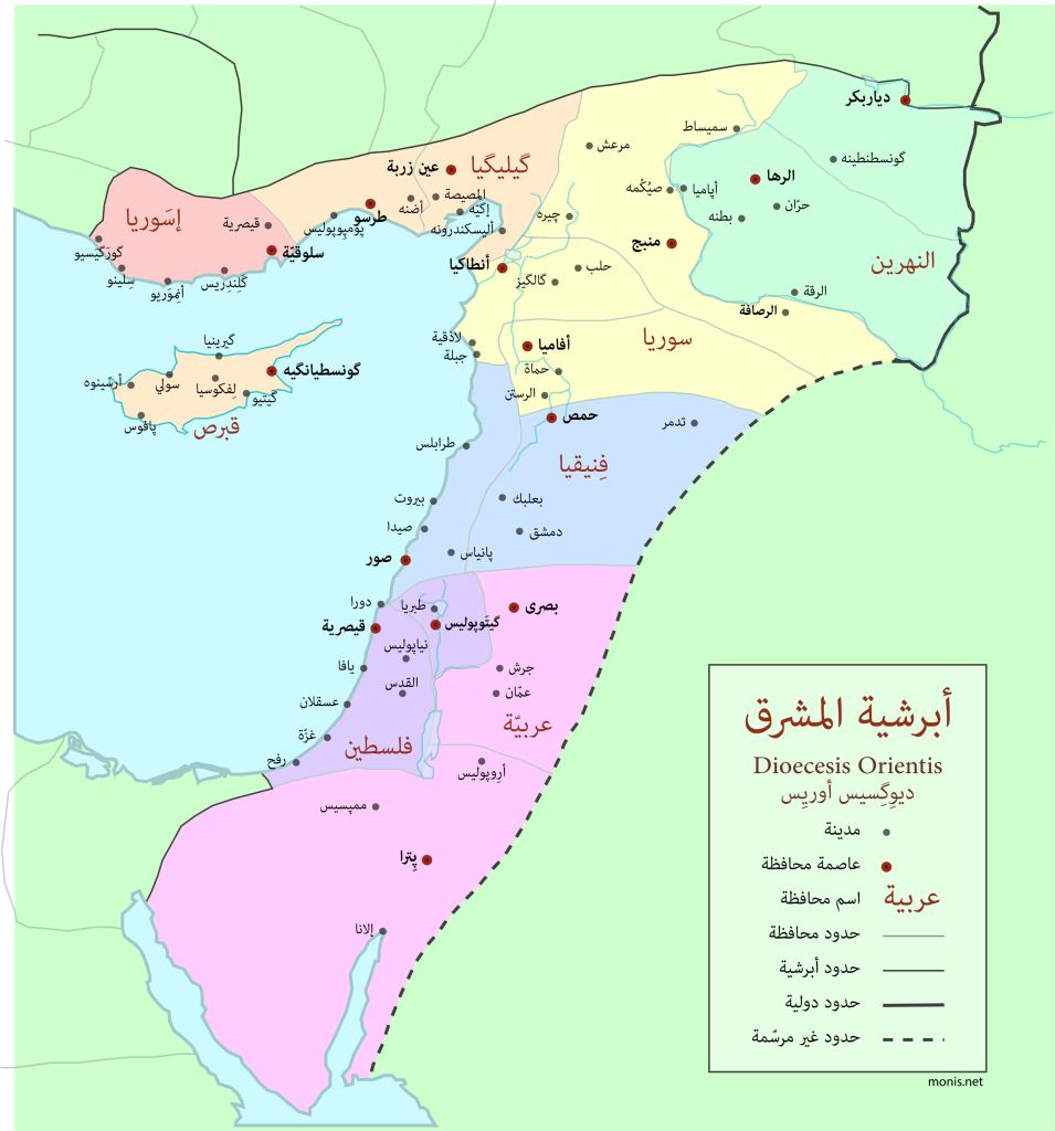 وبرغم أننا لسنا بحاجة إلي اثبات عروبة فلسطين فمن ضمن هذه الخرائط من يخدم ذلك الغرض أيضاً، كخريطة الأبرشية الشرقية "البيزنطية"، وفى الحقيقة فكل الخرائط تخدم ذلك الغرض لأنها تثبت أنه لم يكن هناك كيان اسمه "****"، أعتذر.. لا نعترف بذلك الاسم من الأساس وبالتالي لم نذكره.
